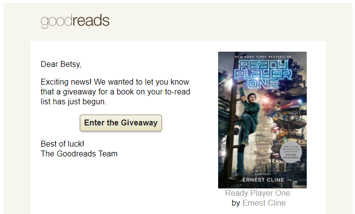Again, Goodreads uses your Want to Read shelf to send you a targeted email. This time, it's for a giveaway, usually for a certain number of print books of one of the books on your Want to Read shelf. You enter to win and hope for the best.