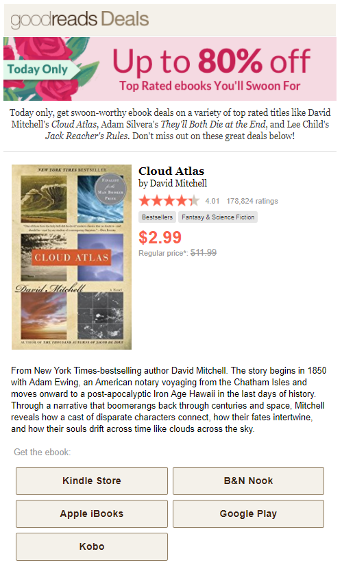 This is a good option if you're looking for books that you haven't considered yet or in a different genre from what you usually read. Here, Goodreads emails you a list of popular books in a variety of genres that are on sale (again, 60%, 70%, or 80% off, usually in that $0.99 - $2.99 price range).