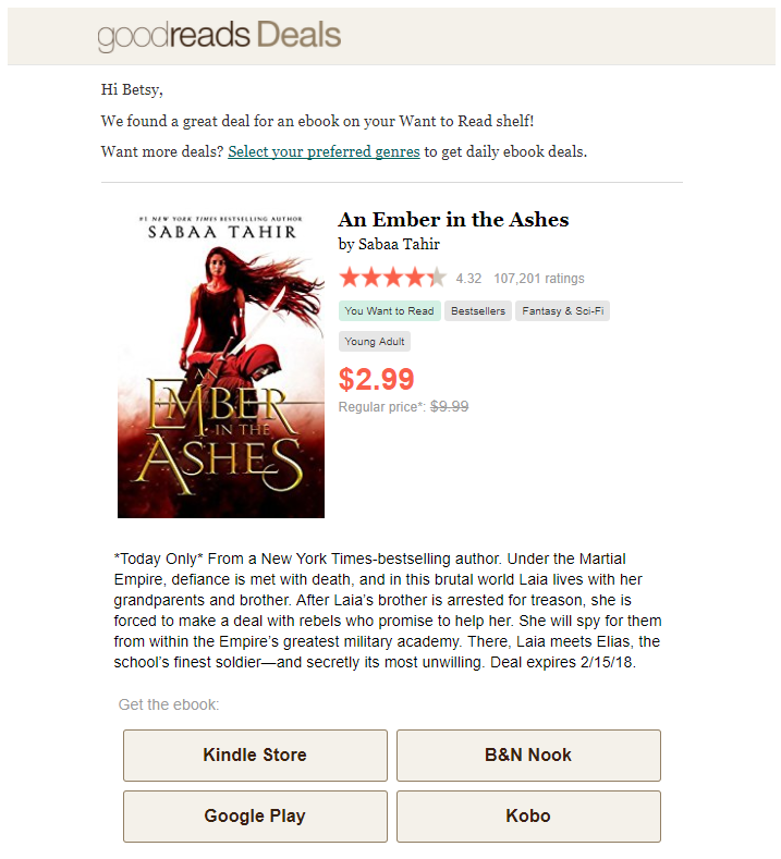 This is by far my favorite thing Goodreads does. When a book on your Want to Read shelf is discounted, Goodreads sends you a quick little email telling you so. For me, this works wonders. Typically, the things stopping me from buying a book are the price (especially for traditionally published books that tend to be $9.99 or more) and already having more books to read than I have time for.