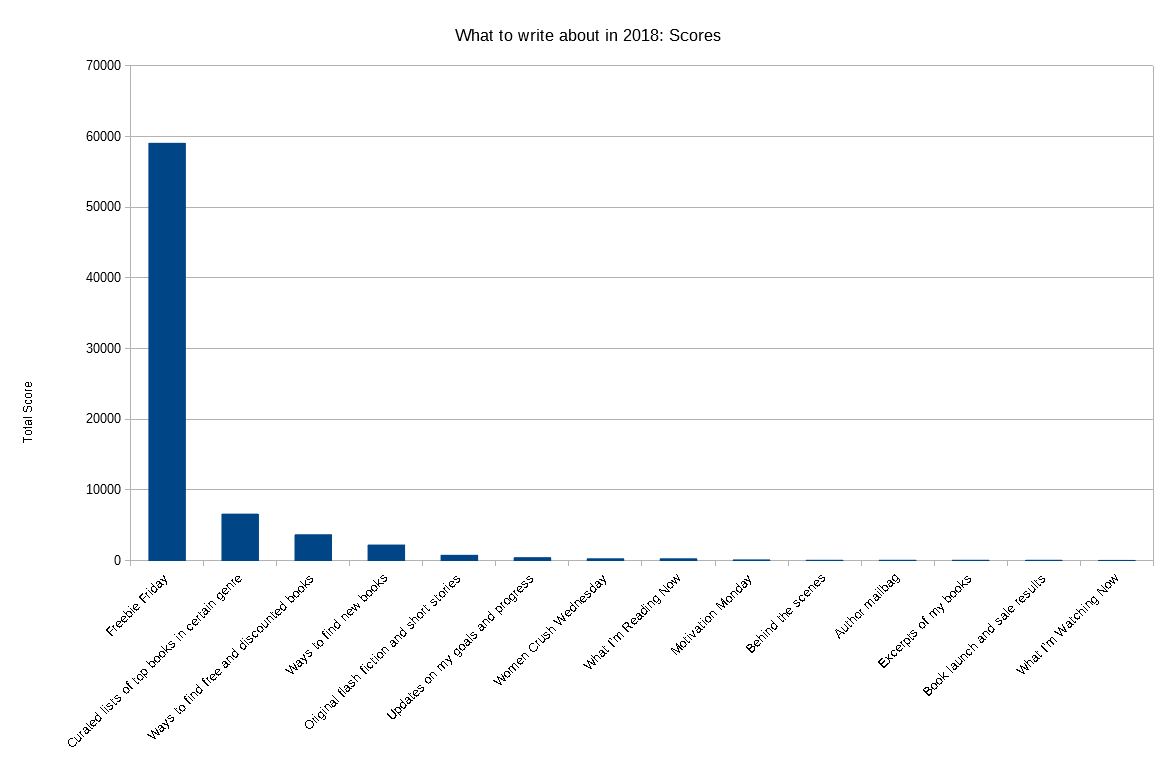 From there, it was pretty easy. All I did was multiply the scores and see what happened. As you can see, "Freebie Friday" won by a long shot. Essentially, it's a win-win-win. Readers want to hear about free books and giveaways. The posts are easy for me to write. And it's an opportunity for me to network with other authors by telling you, my readers, about their free books and giveaways. The only drawback is that these posts aren't super interesting to write. Given that it's such a low time commitment, though, I'll gladly write them up.
