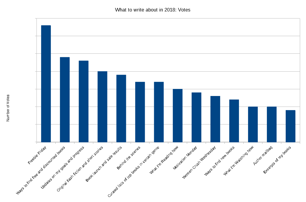Now, because I'm not blindly following the votes (see Part 2 below), I added a score to each voting result. Because "Freebie Friday" was far and away the most requested topic, it got a 9. The next two ("Ways to find free and discounted books" and "Updates on my goals and progress") were a bit higher than the rest, so I gave them each a 5.* Everything from "Original flash fiction and short stories" through "Ways to find new books" got a 3, with the rest getting 1's. Ideally, there would have been a more obvious break in the data like that between "Freebie Friday" and "Ways to find free and discounted books," but them's the breaks (or not, in this case).